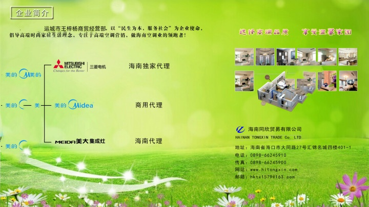 海口秀英柳在个百货商行(个体工商户)是三菱电机家用和商用空调全省独家代理, 美的商用变频空调和空气能热水器全省独家代理,浙江美大集成灶海南省代理。