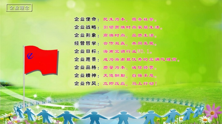 我们以“质量为本,诚信经营”为企业品格,以“合作双赢,共同发展”为经营理念,发扬“天道酬勤、自强不息”的企业精神,树立“高端品质,非凡感受”的企业形象,以“微笑、真诚、快捷、周到”为服务准则,尽我所能,让顾客满意,为实现海南空调行业NO.1,成为海南最优秀的空调代理经销商的发展目标而努力不懈地奋斗。